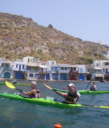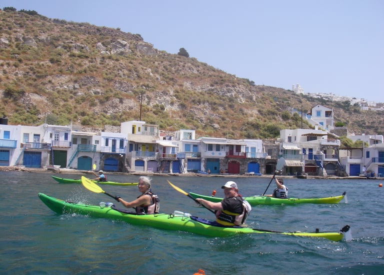 Every trip can lead to stories. Here my wife, Caroline, and I are kayaking along the coast of Milos, Greece.
